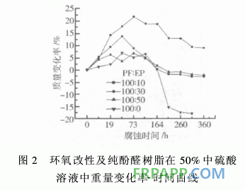 圖2為環(huán)氧改性及純的酚醛樹脂在50%硫酸溶液中重量 變化率-時間曲線,從圖中可以看出,純酚醛樹脂的耐腐蝕性能 仍最差,在先吸水增重到達最高點5%,117h以后,開始急劇 失重,直到211h時以后,失重趨勢才趨于平緩,而此時的質(zhì)量 已經(jīng)減少了20%左右,測試全部結(jié)束即360h時,純酚醛樹脂 的重量一共減少了22%左右。環(huán)氧改性過的試樣耐腐蝕性能 大大提高,變化趨勢大致相同,從圖上看來,質(zhì)量損失最少的 是PF∶EP=100∶50的配方,腐蝕結(jié)束后,△%為5%。其余 兩個配方的改性試樣△%均大于10%。