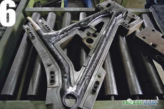 6、當(dāng)所有碳布都貼上去,將預(yù)成型的車架放到鋼模具中,加熱到130°C,使用12bar氣壓進(jìn)行加壓,維持40分鐘,固化成碳纖維車架。