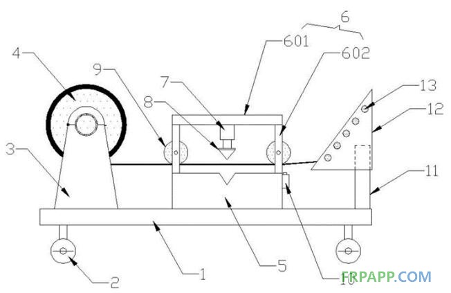 本實用新型公開了一種高硅氧玻璃纖維布分卷機,包括工作臺,工作臺的底部左右兩側(cè)對稱連接有移動輪,工作臺的頂部左側(cè)連接有安裝架,安裝架的上端架設(shè)有放料輥,工作臺的頂部中段連接有切割底座,切割底座的頂部連接有立架,立架的內(nèi)腔頂部連接有液壓桿,液壓桿的底部活動端連接有切刀,立架的左右兩端轉(zhuǎn)動連接有脹緊輥,切割底座的右側(cè)壁頂部連接有光感計數(shù)器,工作臺頂部右側(cè)的前后端對稱連接有立柱,立柱的頂部插接有固定座,兩組固定座之間可拆卸安裝有若干組分卷輥。本實用新型結(jié)構(gòu)設(shè)計合理,本裝置有效降低了操作人員的勞動強度,提高了分卷效率,具有較高的實用價值。